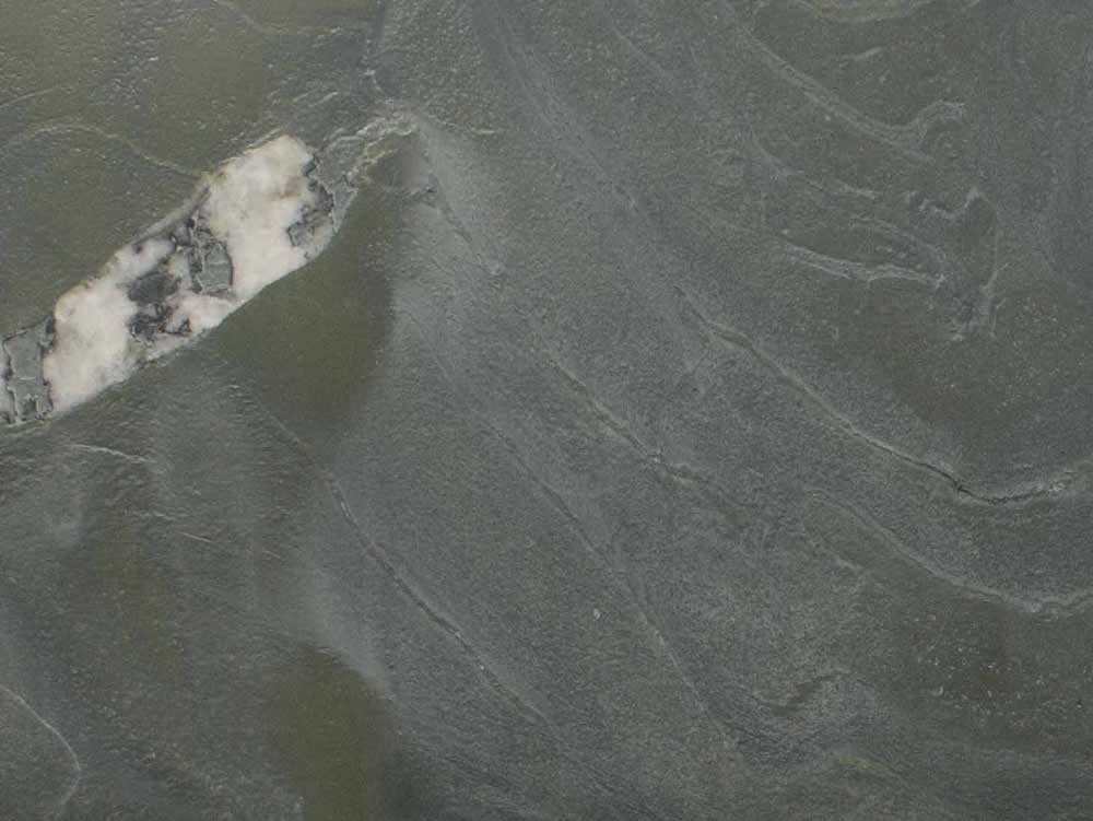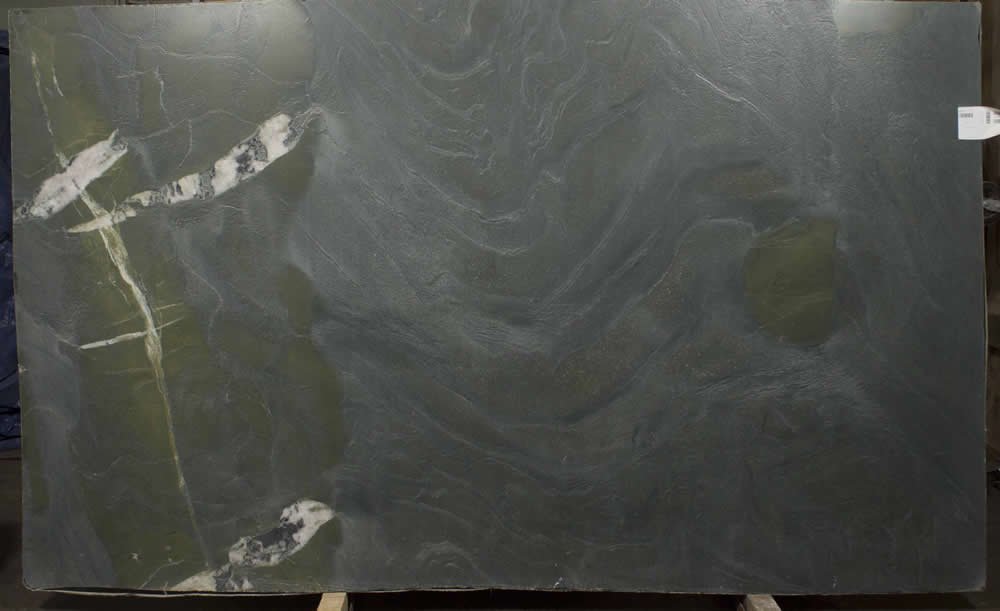 Avocado is interesting stone with the same colorations of an actual avocado. Its background is deep grey with a greenish hue. There are inserts of whites and greys and browns. The leathered version mutes some of the green.