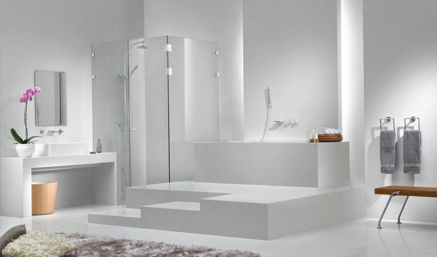 A clean and refreshing white base, sprinkled with tiny grey grains for a touch of warmth and versatility.