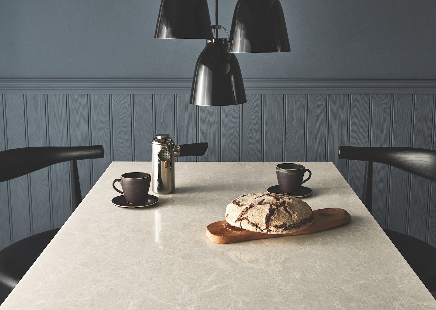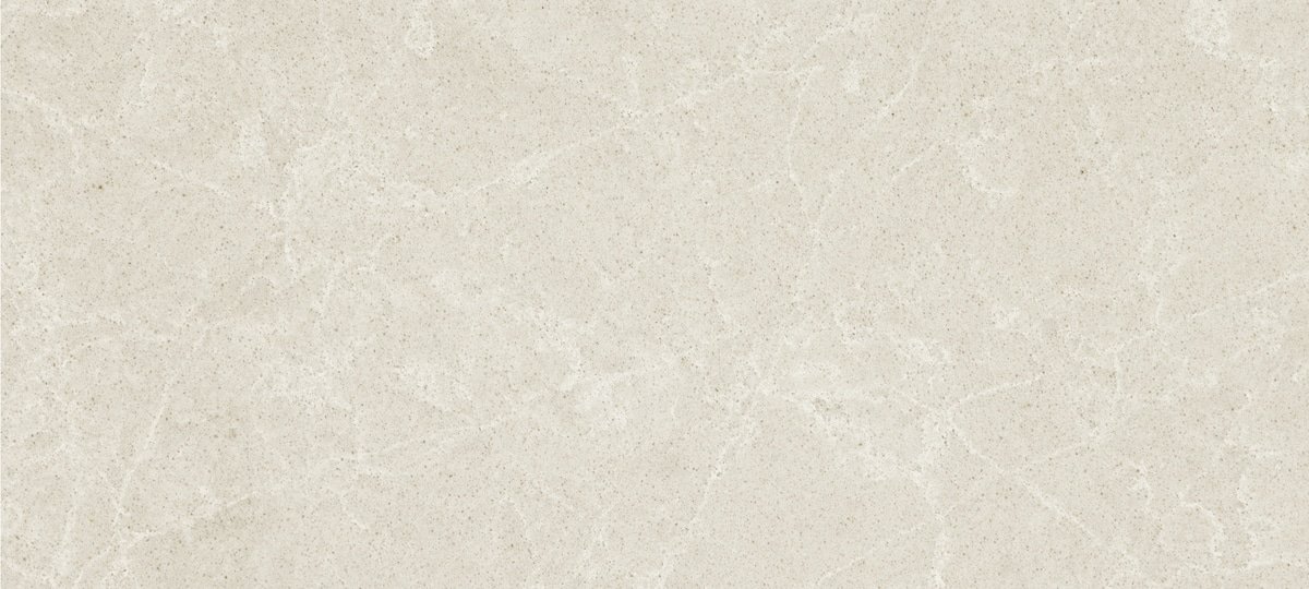 A delicate mesh of streaks and speckles wrap this cream-colored surface, traversing it in a crossway of elegant ashen shades.