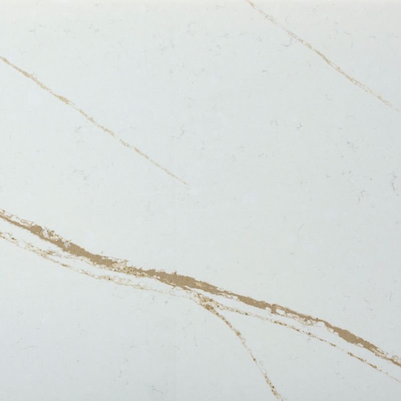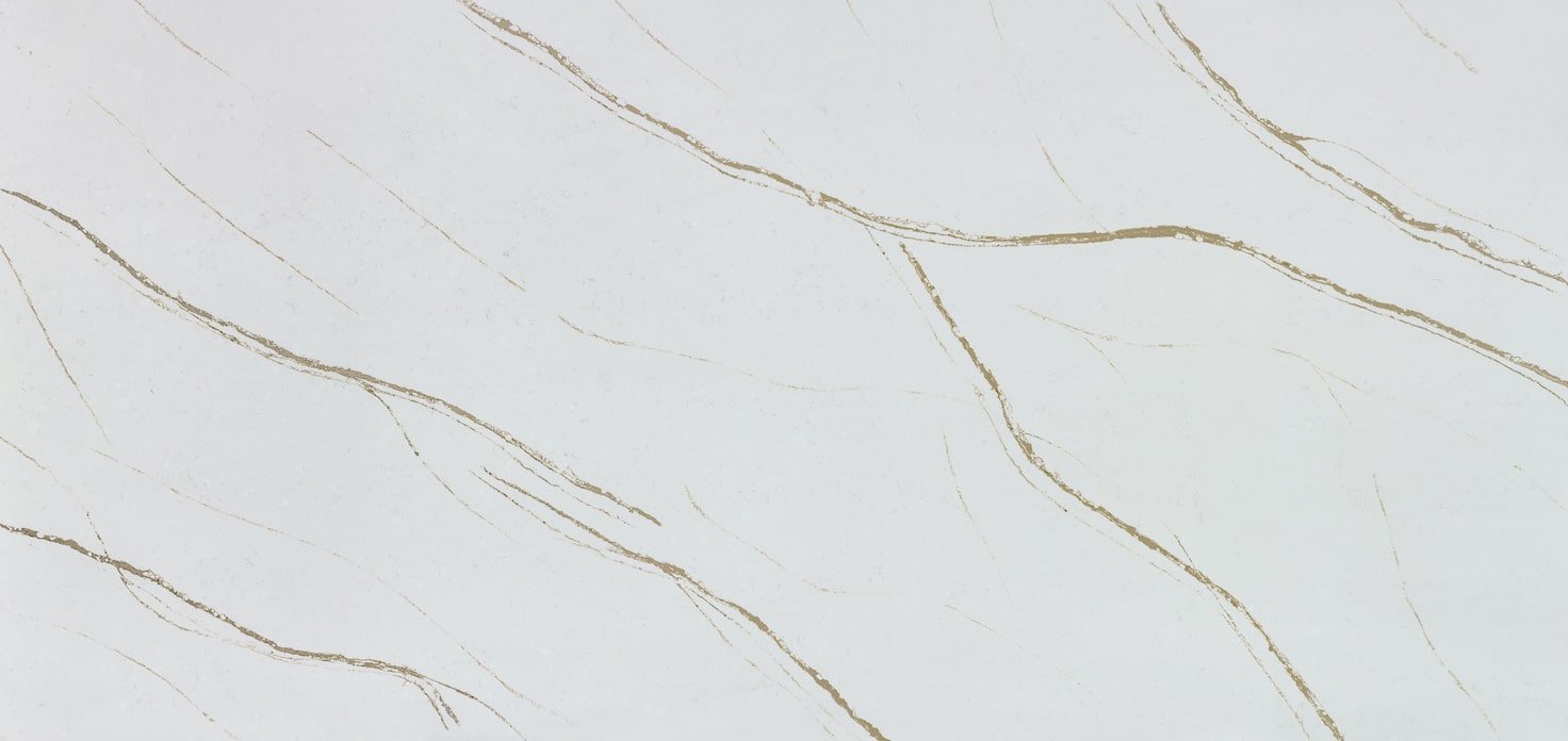 Et D’or is primarily a bight white quartz countertop with bold and striking gold veins flowing throughout the surface that resembles the pattern of the ever-popular calacatta stones. The bright white surface contains faint silver-gray patterns to add unique dimension to this show-stopping quartz countertop.