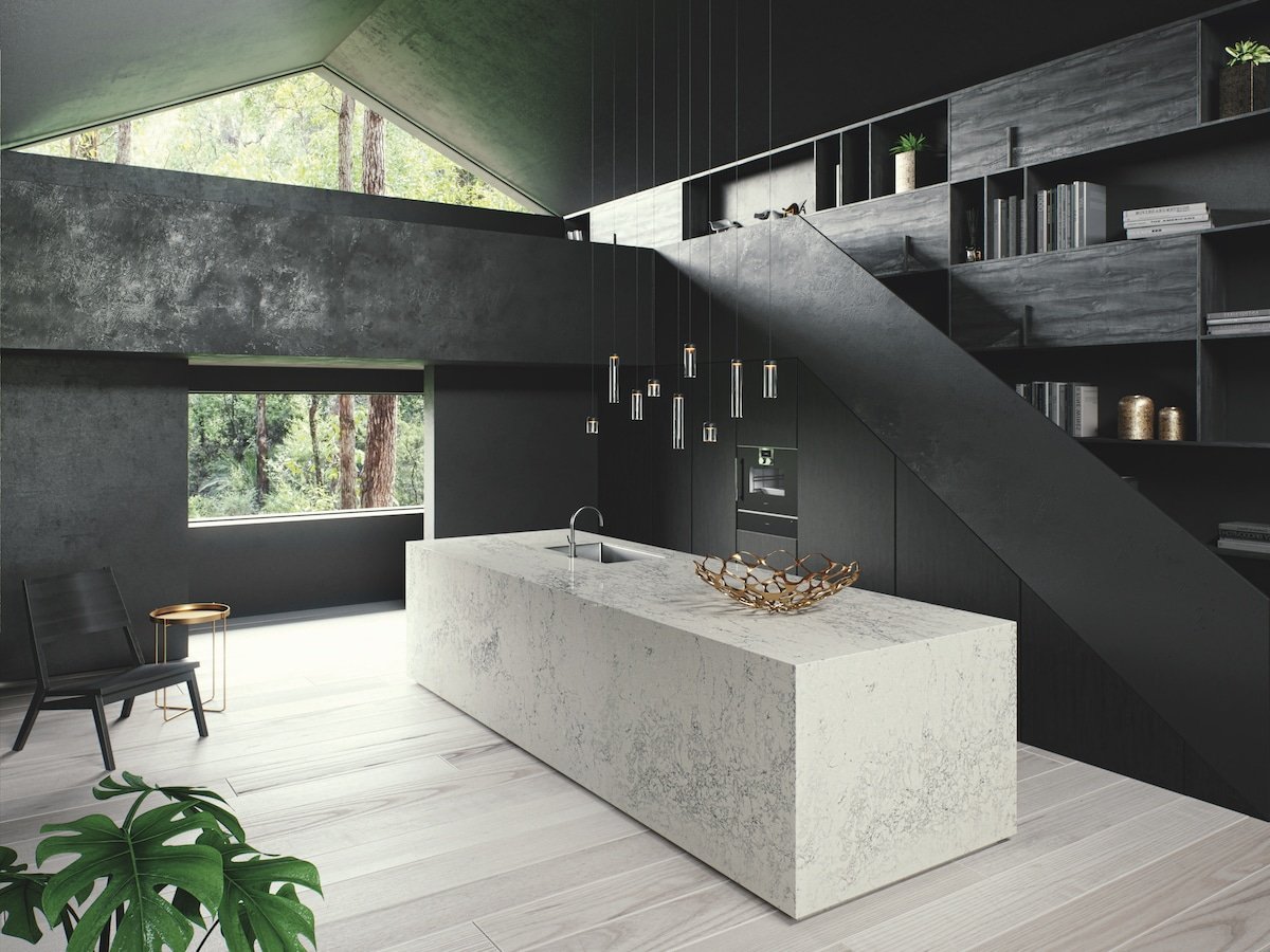 A powerful combination of dark dashes that enrich a harmonious light-grey base, dominated by the movement of streaks and swirls.