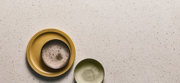 Chunky course-grained textures and neutral-colored mineral chips, on a classic white canvas.