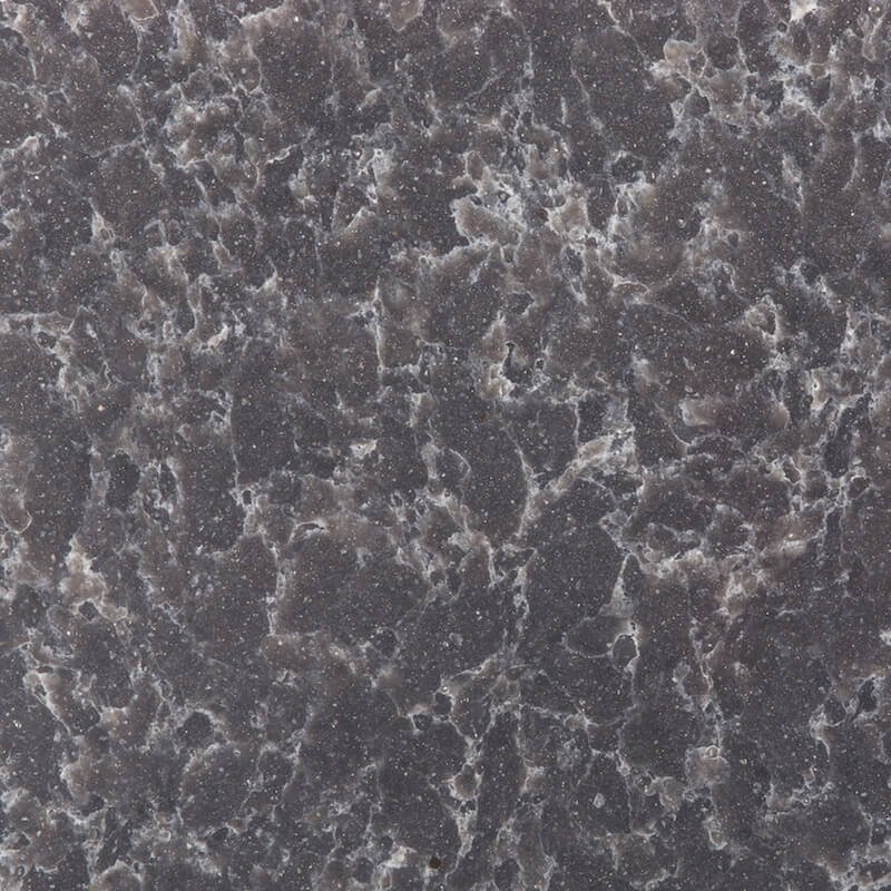Ocean Storm is a black quartz countertop with a dark blue-gray surface color and green undertones. The quartz material has beautiful white waves and beige veining moving throughout, as well as stunning deposits of brown and white. Shimmering can be prominently seen in speckles of gold, silver, white, blue, and bronze.