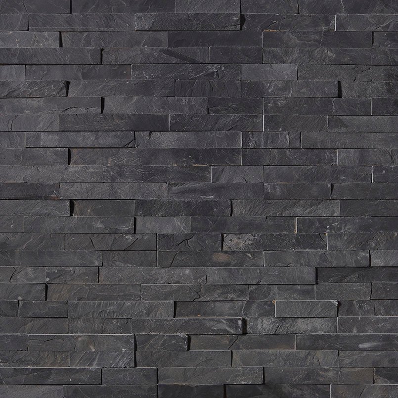 Premium Black Stacked Stone is a solid deep black, low variation durable slate. Use to create a unique slate backsplash or accent wall. This backsplash tile is perfect for both interior and exterior usage.