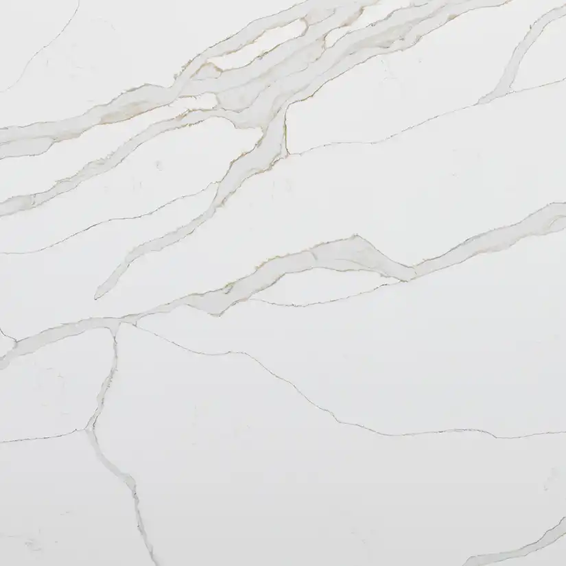 With incomparable color and beauty, Calacatta Solessio Quartz delivers high-end beauty at an affordable cost. This gorgeous quartz slab features a bright white background punctuated by thick veins that contain a cool, blue-grey filling with rust-colored veins are the perimeter –the most complex thick-vein Calacatta Designs on the market today. Durable, stain-resistant, and germ-resistant, this quartz is ideal for residential and commercial applications. Create jaw-dropping waterfall islands, countertops, bars, accent walls, backsplashes, and more with Calacatta Solessio.