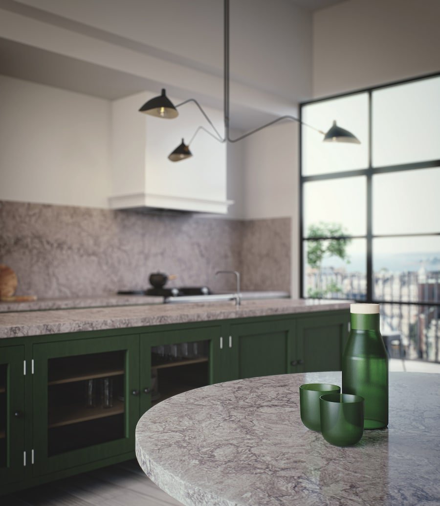 A nuanced palette of grey swirls, with dark and light veins that capture the moving texture of genuine granite.